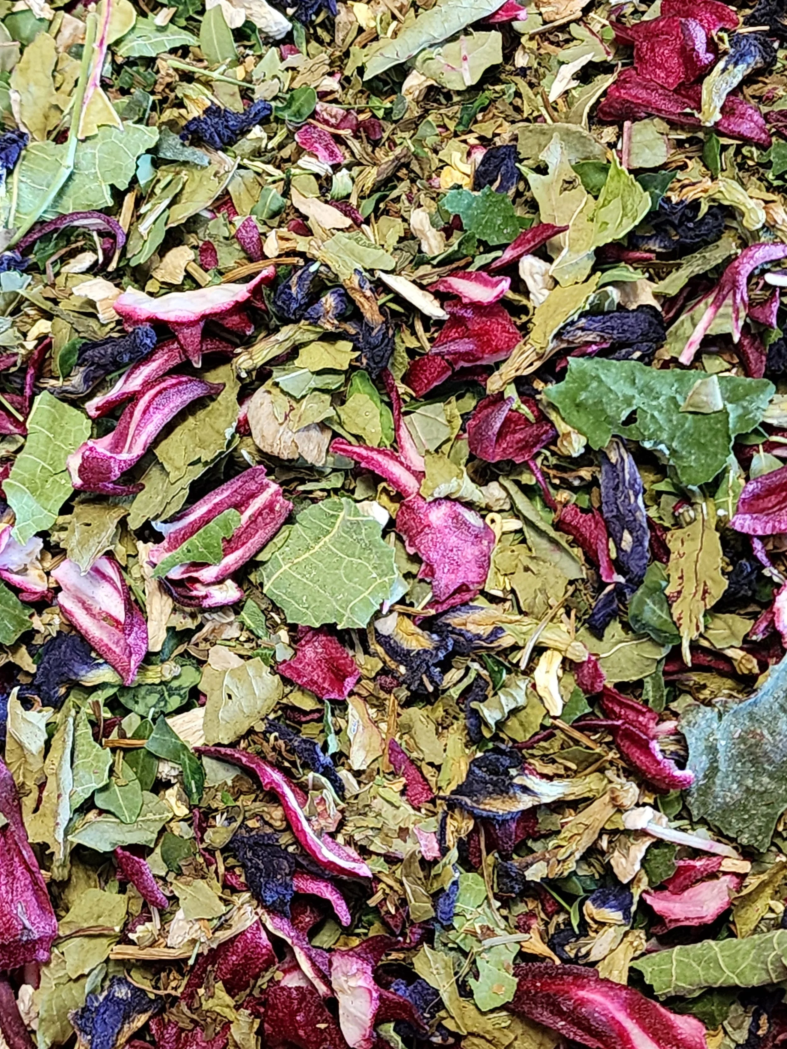 Our seasonal mushroom tea is medicine in a cup. Come spring, come fall, we grow, harvest and freeze dry a selection of herbs and mushrooms and blend together to create our top seller mushroom tea. This fall we combined our organically grown lion’s mane, oyster mushrooms, red roselle, moringa, fig leaf, butter fly pea flower, hibiscus leaf, gotu kola and spearmint into a perfect blend of health and taste. Enjoy the wellness benefits including antioxidants and immune boosting properties, digestive health, vitamins and minerals, and rich in fiber all while promoting concentration, regenerative brain function, stress relief and tranquility.